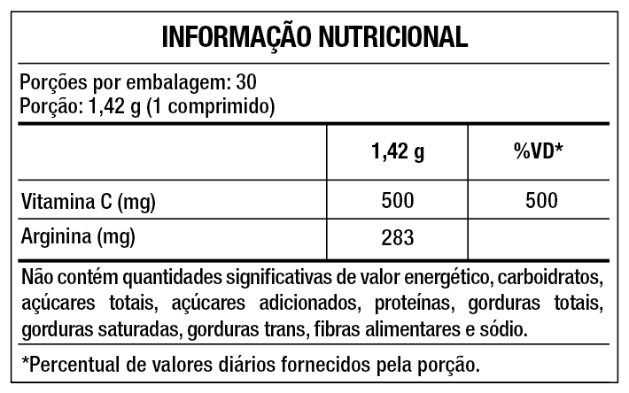 Ácido ascórbico (Vit. C) e L-aspartato de L-arginina (Arginina); Agente de massa: celulose microcristalina; Estabilizante: croscarmelose sódica; Antiumectantes: dióxido de silício e estearato de magnésio; Espessante: hidroxipropilmetilcelulose; Glaceante: polietilenoglicol; Corantes: dióxido de titânio e vermelho allura Ac. NÃO CONTÉM GLÚTEN