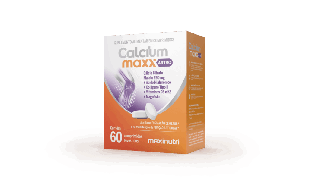 Calcium Maxx ARTRO é um suplemento alimentar em comprimidos revestidos composto por citrato malato de cálcio, vitaminas D3 e K2, Ácido Hialurônico, Colágeno tipo II e magnésio. Este produto foi desenvolvido para complementar a ingestão diária de cálcio e demais vitaminas essenciais para o organismo.