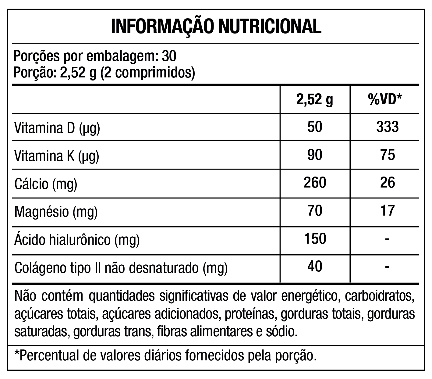 Citrato malato de cálcio (Cálcio), bisglicinato de magnésio (Magnésio), hialuronato de sódio obtido pela fermentação de Streptococcus zooepidemicus (Ácido hialurônico), colágeno de frango com colágeno tipo II não desnaturado (Colágeno tipo II não desnaturado), menaquinona-7 (Vit. K) e colecalciferol (Vit. D); Agentes de massa: celulose microcristalina e sorbitol; Estabilizante: croscarmelose sódica; Antiumectantes: dióxido de silício e estearato de magnésio; Espessante: hidroxipropilmetilcelulose; Corante: dióxido de titânio; Glaceante: polietilenoglicol.NÃO CONTÉM GLÚTEN