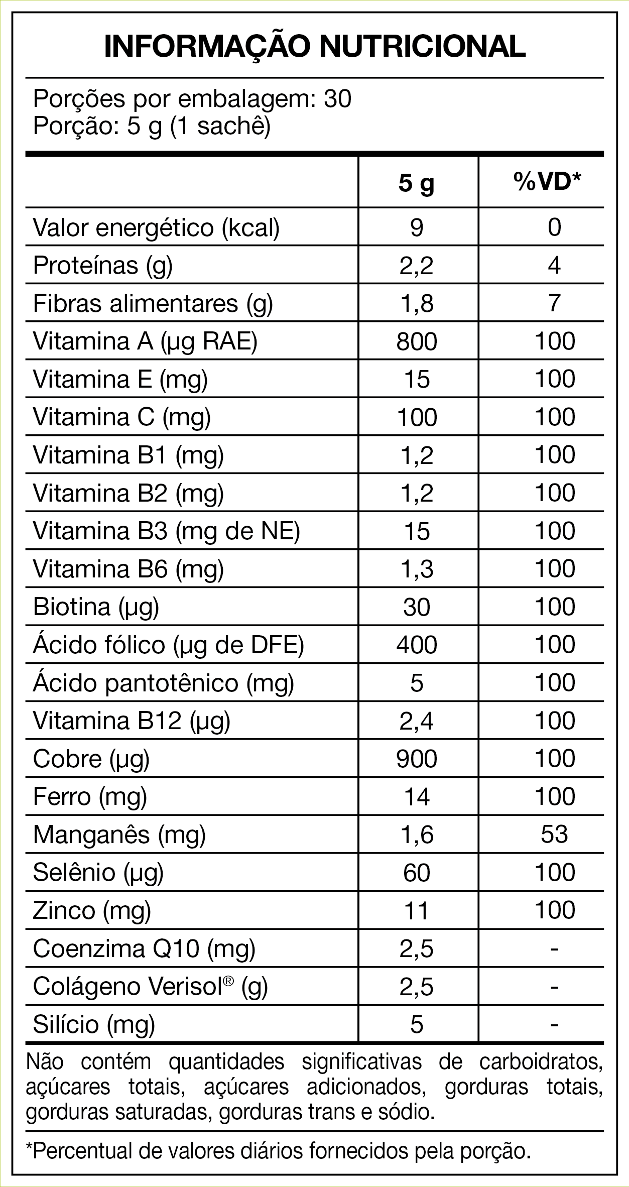 Peptídeos bioativos de colágeno hidrolisado com peso molecular médio de 2kDa (VERISOL®), ácido ascórbico (Vit.C), açafrão, maltodextrina, pirofosfato férrico (Ferro), acetato de DL-alfatocoferila (Vit. E), sulfato de zinco monoidratado (Zinco), nicotinamida (Vit. B3), acetato de retinol (Vit. A), ácido ortosilícico estabilizado em maltodextrina (Silício), D-pantotenato de cálcio (Ácido pantotênico), sulfato de manganês (Manganês), coenzima Q10, sulfato cúprico (Cobre), cloridrato de piridoxina (Vit. B6), tiamina mononitrato (Vit. B1), riboflavina (Vit. B2), ácido fólico, selenito de sódio (Selênio), D-biotina (Biotina) e cianocobalamina (Vit. B12); Agente de massa: polidextrose; Acidulante: ácido cítrico; Antiumectantes: dióxido de silício, fosfato tricálcico e silicato de magnésio hidratado (Talco); Aromatizante: aroma sintético idêntico ao natural; Regulador de acidez: citrato trissódico; Edulcorantes: glicosídeos de esteviol glicosilados, sacarina sódica e acessulfame de potássio. NÃO CONTÉM GLÚTEN
