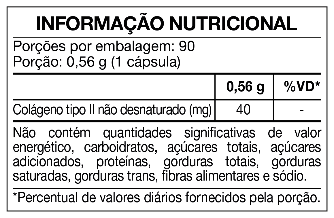 Amido e colágeno de frango com colágeno tipo II não desnaturado (Colágeno tipo II não desnaturado); Antiumectantes: silicato de magnésio hidratado (Talco), dióxido de silício e fosfato tricálcico; Cápsula: Gelificante: gelatina; Corante: dióxido de titânio, azul brilhante FCF e eritrosina.