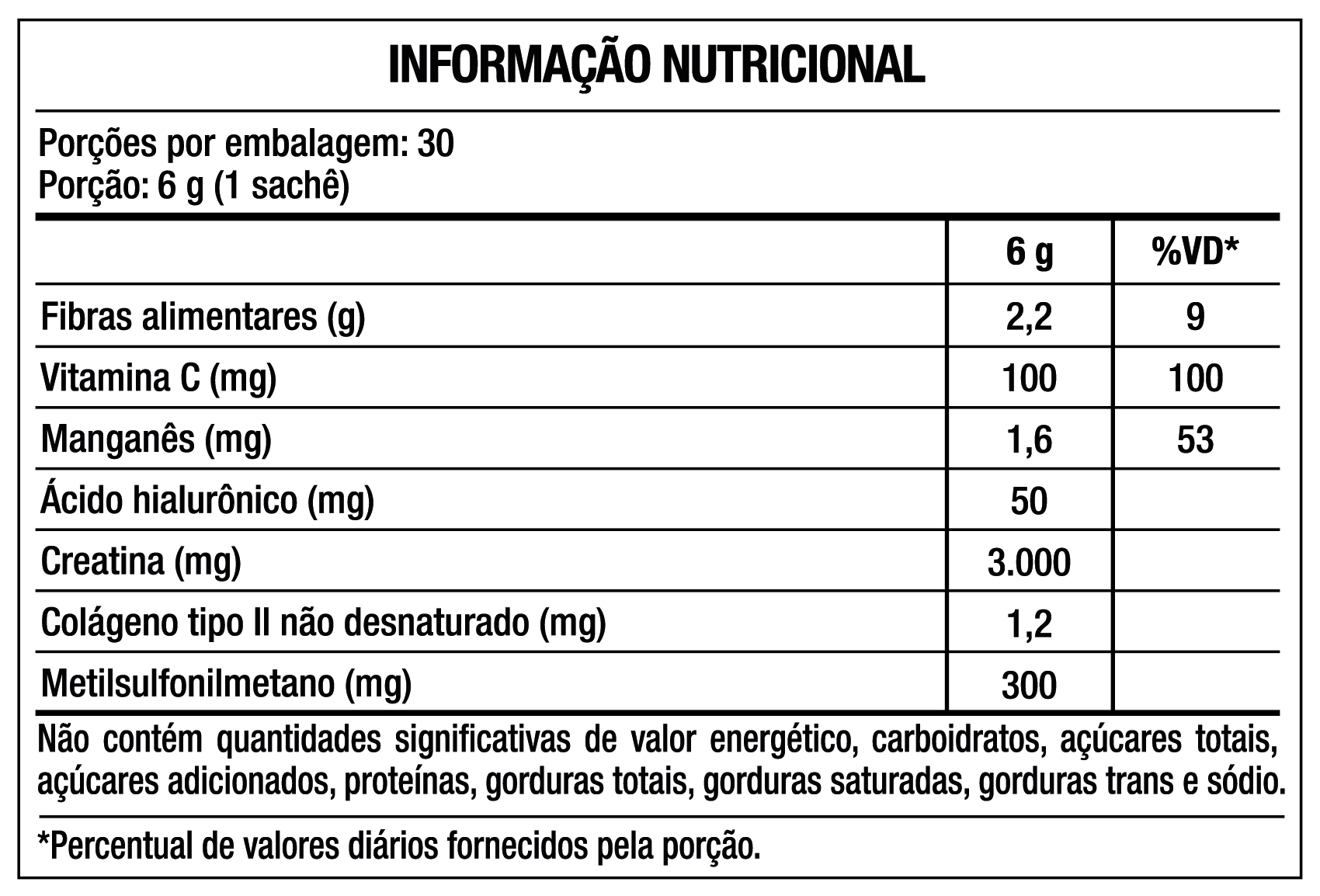 Creatina monohidratada, metilsulfonilmetano (MSM), ácido ascórbico (Vit. C), hialuronato de sódio obtido pela fermentação de Streptococcus zooepidemicus (Ácido hialurônico), colágeno de frango com colágeno tipo II não desnaturado (Colágeno tipo II não desnaturado) e bisglicinato de manganês (Manganês); Agente de massa: polidextrose; Antiumectante: dióxido de silício. NÃO CONTÉM GLÚTEN