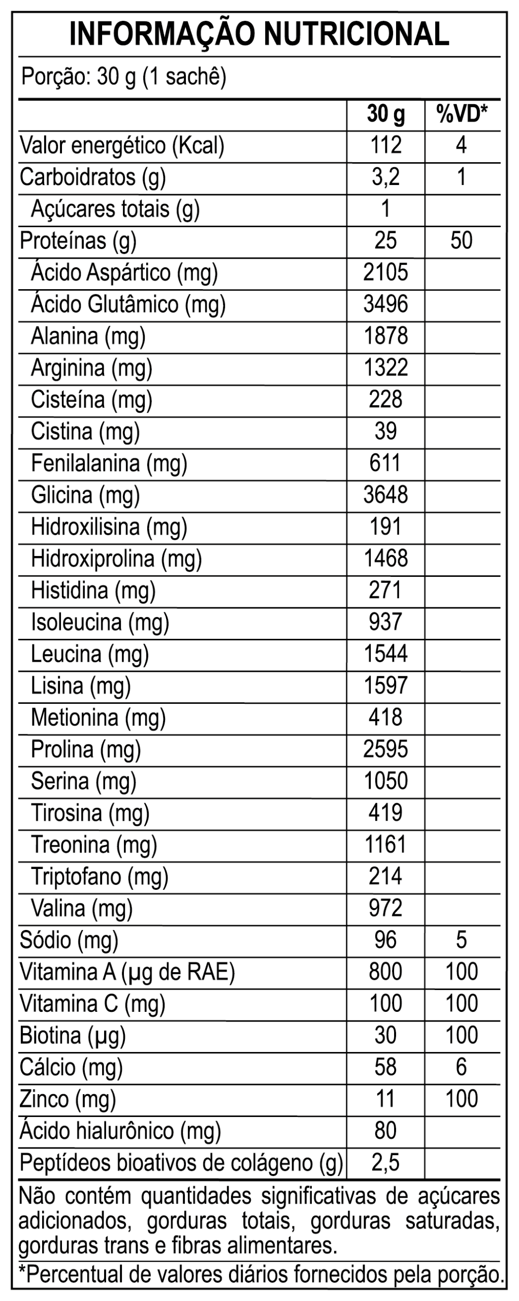 Colágeno hidrolisado, proteína de soro do leite isolada, peptídeos bioativos de colágeno hidrolisado com peso molecular médio de 2kDa (VERISOL®), proteína de soro do leite hidrolisada, morango desidratado, ácido ascórbico (Vit. C), hialuronato de sódio obtido pela fermentação de Streptococcus zooepidemicus (Ácido hialurônico), bisglicinato de zinco (Zinco), acetato de retinol (Vit. A) e D-biotina (Biotina); Corante: vermelho beterraba; Aromatizantes: aromas idênticos ao natural; Antiumectante: dióxido de silício; Edulcorante: sucralose; Agente de massa: celulose microcristalina. ALÉRGICOS: CONTÉM DERIVADOS DE LEITE E SOJA. CONTÉM LACTOSE. NÃO CONTÉM GLÚTEN