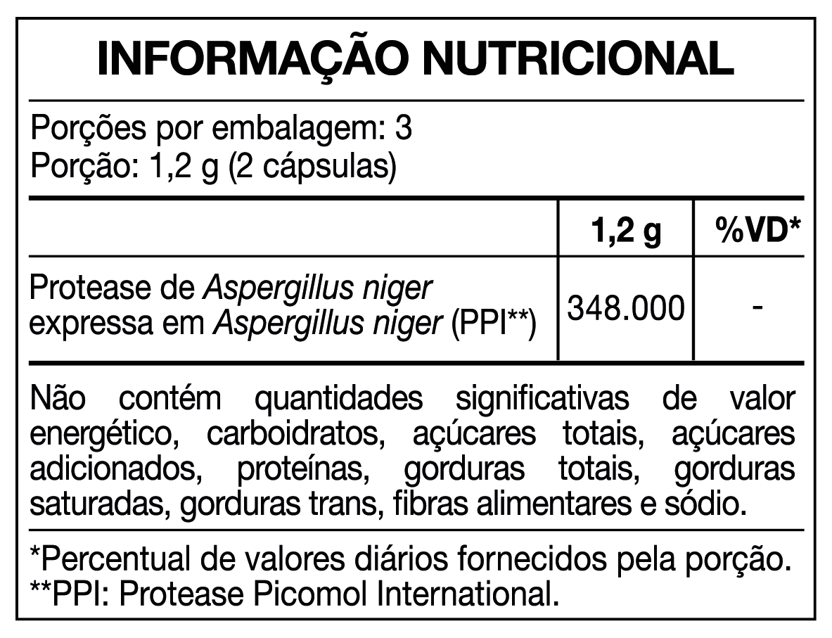 Ingerir 2 cápsulas ao dia, antes do consumo de alimentos contendo glúten.