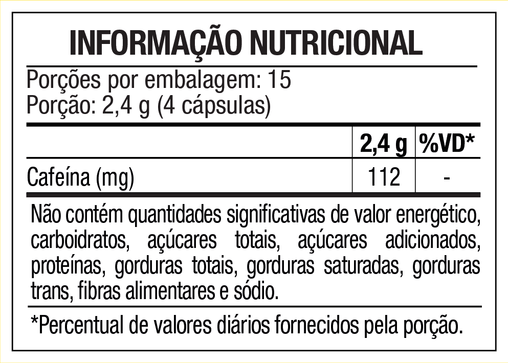 Guaraná em pó (Paullinia cupana) e cafeína; Antiumectante: silicato de magnésio hidratado (Talco); Cápsula: Gelificante: gelatina. NÃO CONTÉM GLÚTEN