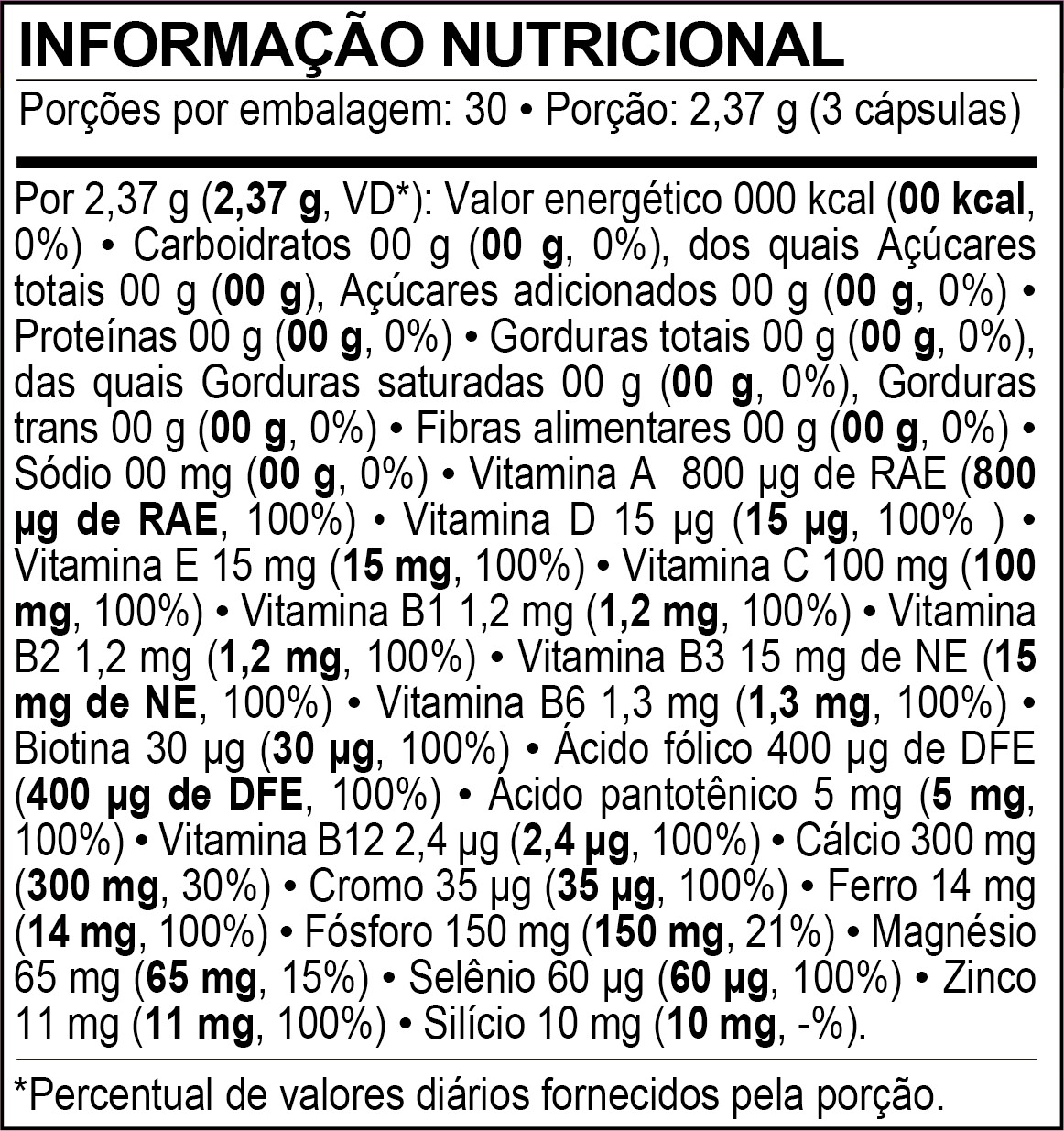 Carbonato de cálcio (Cálcio), fosfato de cálcio dibásico (Fósforo), ácido ascórbico (Vit. C), óxido de magnésio (Magnésio), niacinamida (Vit. B3), acetato de DL-alfatocoferila (Vit. E), pirofosfato férrico (Ferro), sulfato de zinco monoidratado (Zinco), ácido ortosilícico estabilizado em maltodextrina (Silício), D-pantotenato de cálcio (Vit. B5), cloridrato de piridoxina (Vit. B6), tiamina mononitrato (Vit. B1), riboflavina (Vit. B2), acetato de retinila (Vit. A), ácido fólico, selenito de sódio (Selênio), picolinato de cromo (Cromo), D-biotina (Biotina), colecalciferol (Vit. D3), cianocobalamina (Vit. B12) e amido; Antiumectante: silicato de magnésio hidratado (Talco); Cápsula: Gelificante: gelatina; Corantes: dióxido de titânio, azorrubina, azul brilhante FCF e amarelo de quinolina.NÃO CONTÉM GLÚTEN