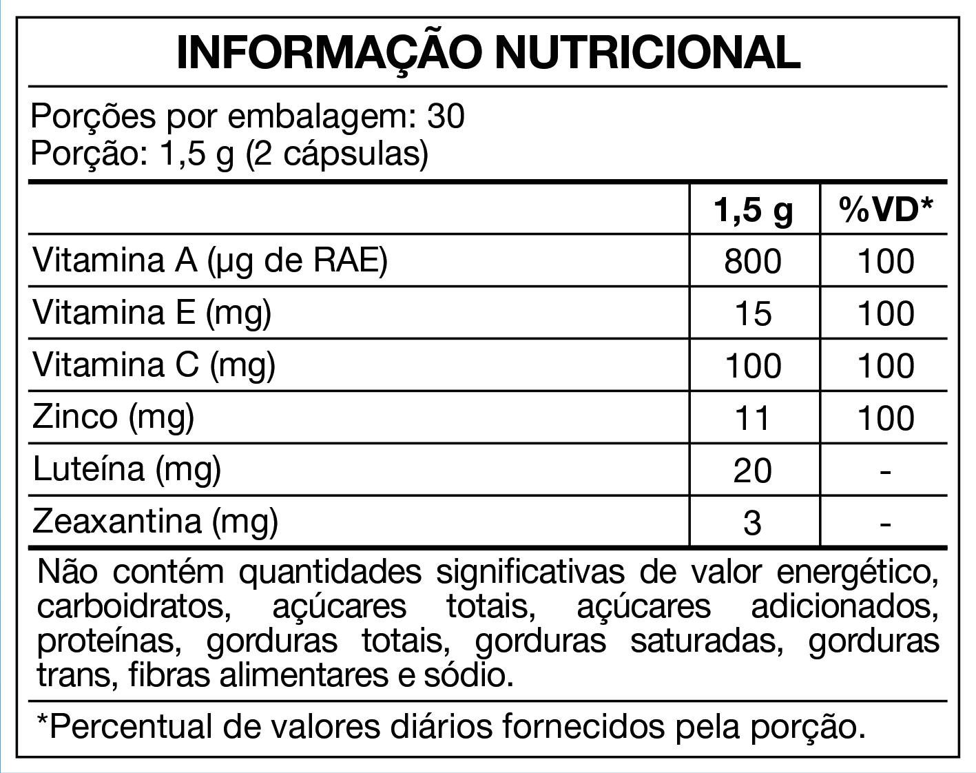 Luteína da flor de Tagetes erecta (Luteína), amido, ácido ascórbico (Vit. C), bisglicinato de zinco (Zinco), zeaxantina, acetato de DL-alfa-tocoferol (Vit. E) e acetato de retinol (Vit. A); Antiumectantes: silicato de magnésio hidratado (Talco), estearato de magnésio e dióxido de silício; Cápsula: Gelificante: gelatina; Corantes: dióxido de titânio, amarelo de quinolina, ponceau 4R e amarelo crepúsculo FCF.