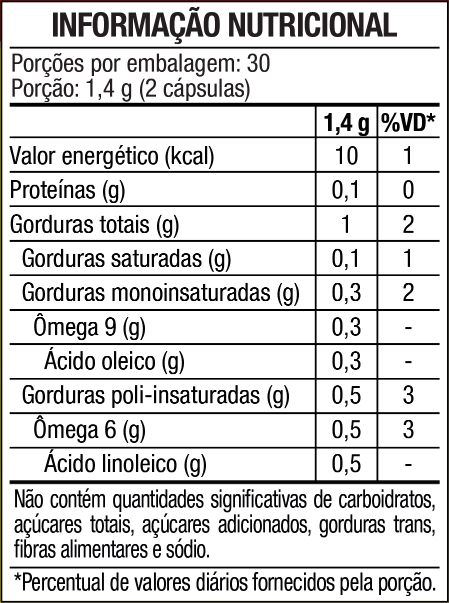 Óleo de girassol (Helianthus annuus L.) e óleo de semente de borragem (Borago officinalis L.); Antioxidante: DL-alfa-tocoferol; Cápsula: Gelificante: gelatina e água purificada; Umectante: glicerol.ALÉRGICOS: PODE CONTER PEIXE E SOJA.NÃO CONTÉM GLÚTEN