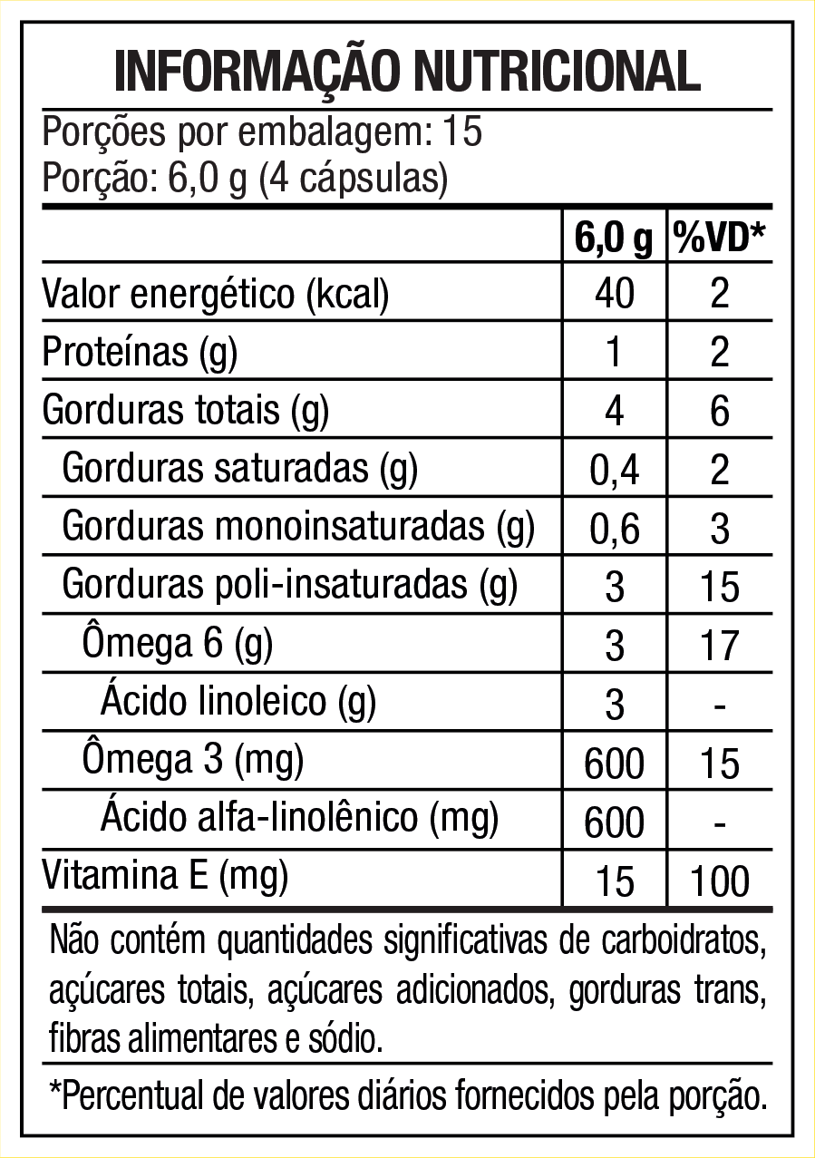 Óleo de cártamo (Carthamus tinctorious L.) e acetato de DL-alfa-tocoferol (Vit. E); Cápsula: Gelificante: gelatina e água purificada; Umectante: glicerol.NÃO CONTÉM GLÚTEN