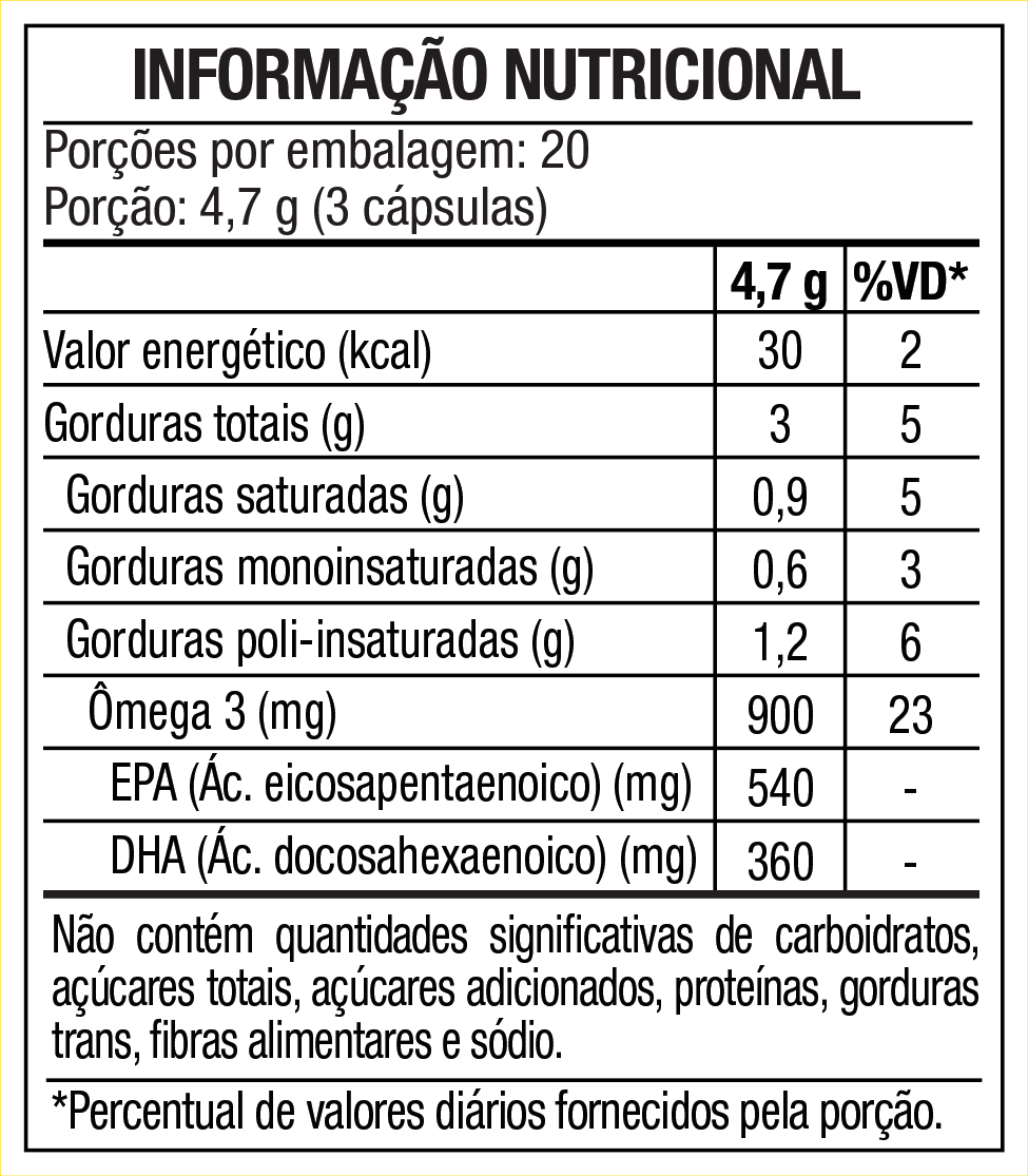 Óleo de peixe; Cápsula: Gelificante: gelatina e água purificada; Umectante: glicerol.ALÉRGICOS: CONTÉM DERIVADOS DE PEIXE.NÃO CONTÉM GLÚTEN