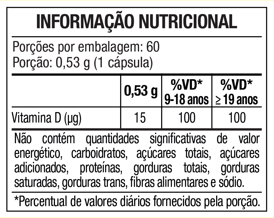 Amido e colecalciferol (Vit. D3); Antiumectantes: silicato de magnésio hidratado (Talco); Agente de massa: celulose microcristalina; Cápsula: Gelificante: gelatina; Corante: dióxido de titânio, amarelo de quinolina, ponceau 4R e amarelo crepúsculo FCF.NÃO CONTÉM GLÚTEN