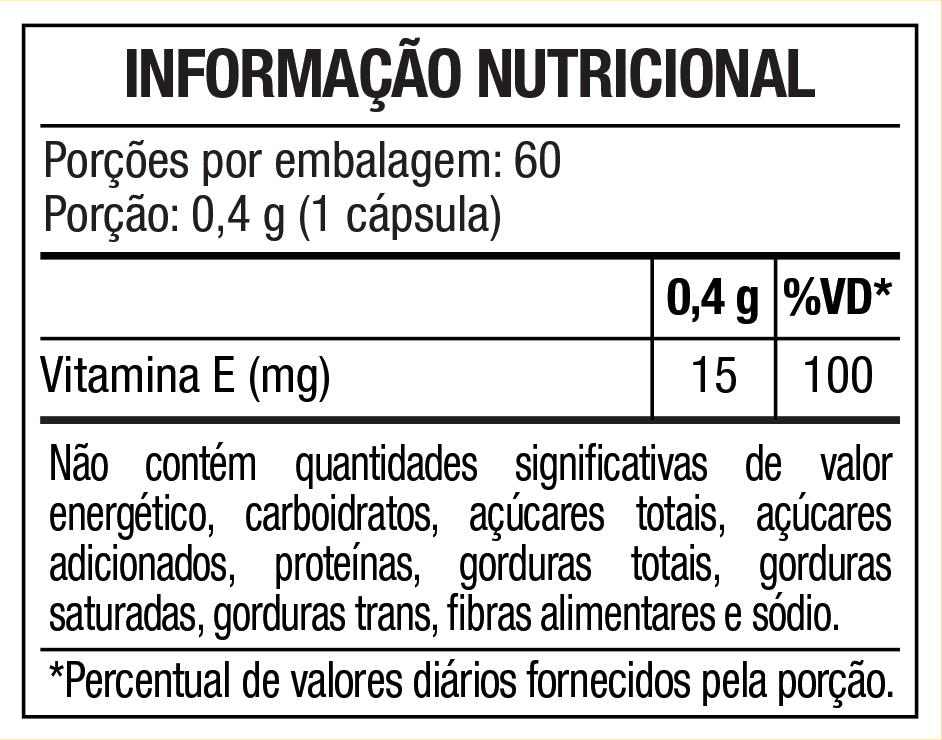 Óleo de girassol (Helianthus annuus L.) e acetato de DL-alfa-tocoferol (Vit. E); Cápsula: Gelificante: gelatina e água purificada; Umectante: glicerol.ALÉRGICOS: PODE CONTER PEIXE E SOJA.NÃO CONTÉM GLÚTEN