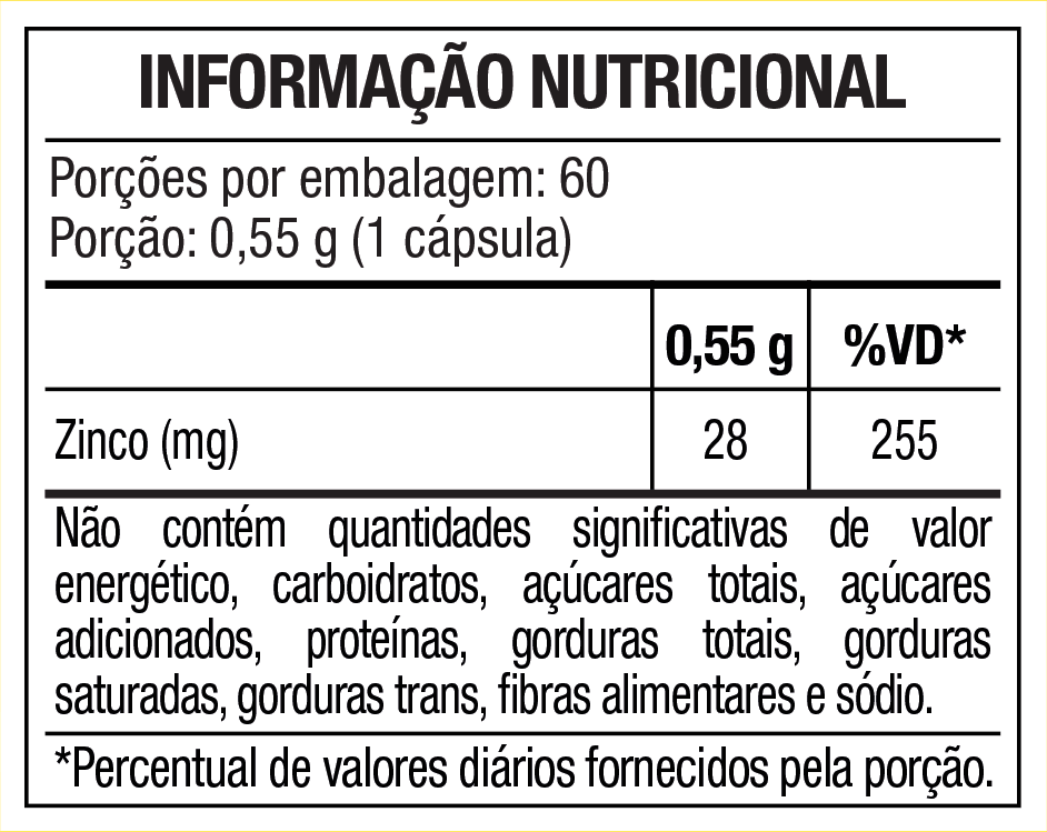 Bisglicinato de zinco (Zinco) e amido; Antiumectante: silicato de magnésio hidratado (Talco); Cápsula: Gelificante: gelatina.NÃO CONTÉM GLÚTEN